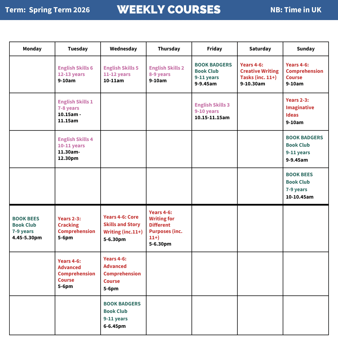 The creative writing courses help children learn storytelling, descriptive writing and literary techniques, while the comprehension courses focus on reading, analysing and understanding texts. Many families choose to take both to build a complete foundation in English.
